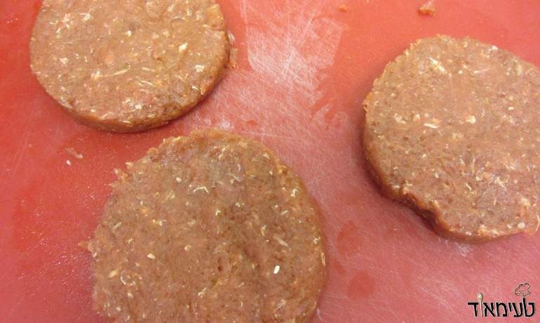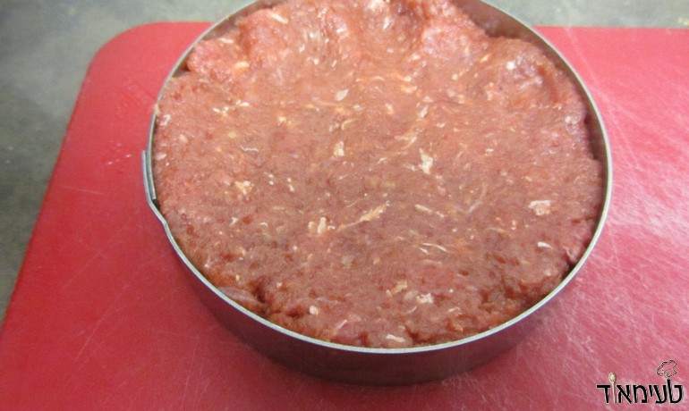 • דוחסים את תערובת הבשר לרינג (טבעת עגולה וגבוהה) שמונחת על משטח שטוח כמו קרש חיתוך ויוצרים המבורגרים בגודל הרצוי (אני השתמשתי בטבעת בקוטר 10 ס"מ שזה בערך 150 גרם בשר).