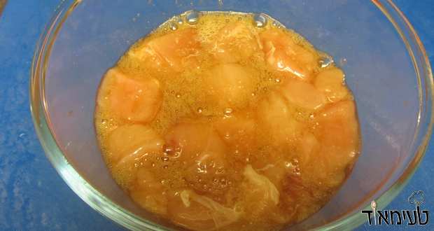 • חותכים את חזה העוף לקוביות בגודל ביס ושמים בקערה.