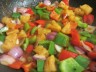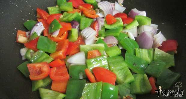 • מוסיפים את קוביות הבצל והפלפלים ומטגנים תוך ערבוב והקפצה 3-4 דקות.