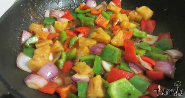 • מוסיפים את נתחי האננס והרוטב החריף מתוק ומערבבים וממשיכים להקפיץ עוד 2 דקות עד שהרוטב מסמיך.
