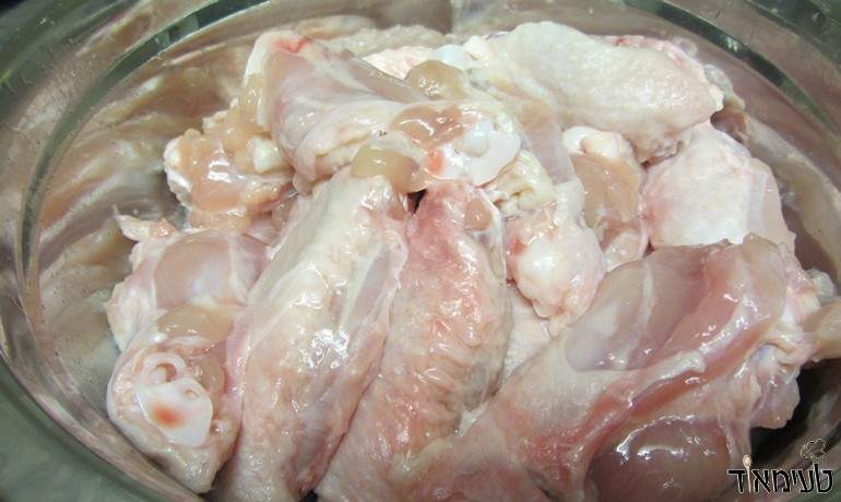 • מנקים את הכנפיים וחוצים אותן באמצע על העצם ומניחים בקערה.