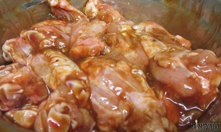 • שופכים את המרינדה לקערה של הכנפיים - ומערבבים טוב טוב בידיים.