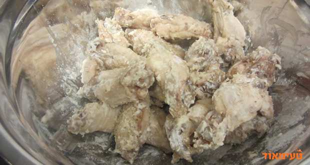 • כשהכנפיים מצטננות מוסיפים להן את הקמח ומערבבים היטב שהקמח יצפה את הכנפיים.