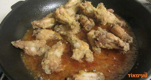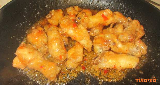 • מוסיפים את הכנפיים למחבת ומתחילים להקפיץ ולערבב במשך 3 דקות עד שכל הרוטב נצמד לכנפיים.