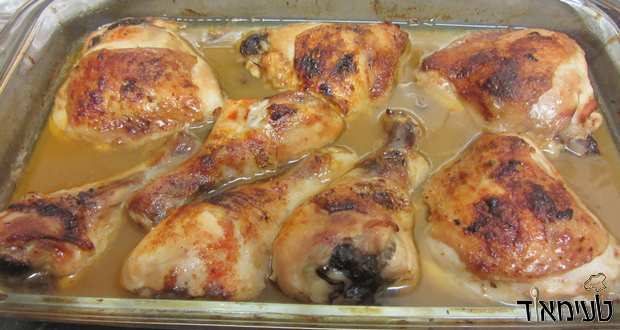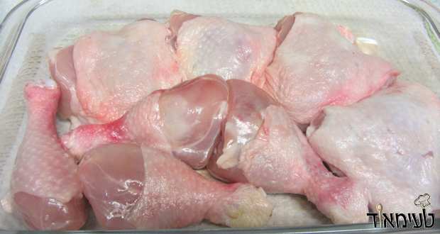 - מסדרים את חלקי העוף בתבנית חסינת חום עם שוליים גבוהים. מומלץ תבנית שתתאים בדיוק לכמות העופות.