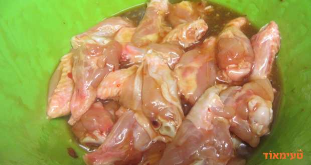 - מנקים את הכנפיים וחותכים אותן על העצם ל2 חלקים ושמים בקערה.