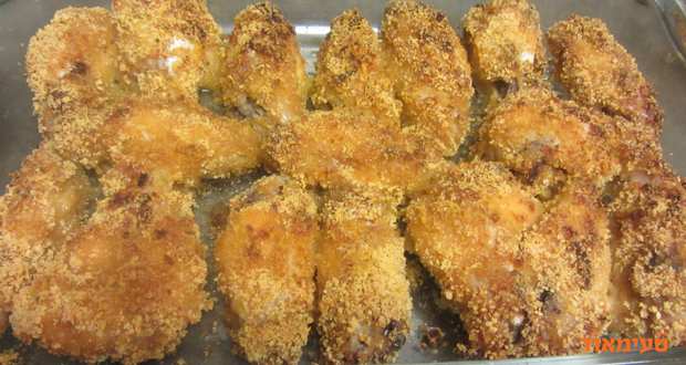 - לוקחים כל כנף מתוך המשרה - מצפים בפרורי לחם ומסדרים על התבנית.