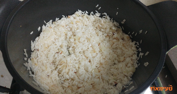 - מוסיפים את האורז ומטגנים תוך ערבוב 2 דקות.