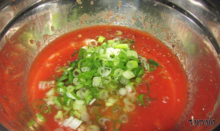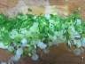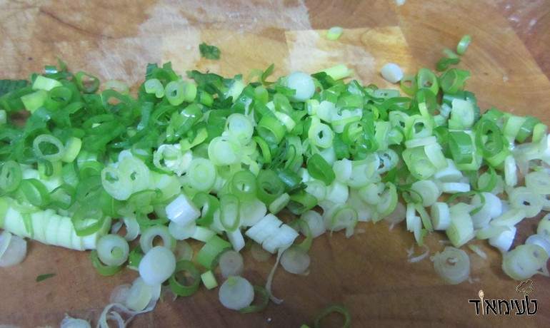 • קוצצים את גבעולי הבצל הירוק לעיגולים קטנים ושמים בקערה.