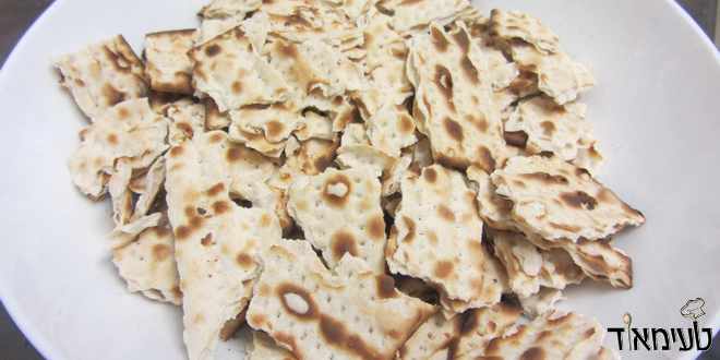 - שוברים את המצות לחתיכות קטנות אבל לא מדי (משהו כמו 2-3 ס"מ לחתיכה) לתוך קערה.